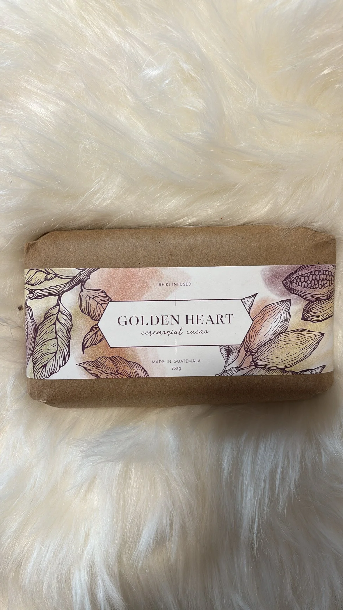 Golden Heart Cacao is reiki-infused, ethically sourced, and prepared with intention to support your daily rituals, meditation, and emotional wellness.